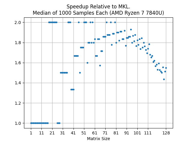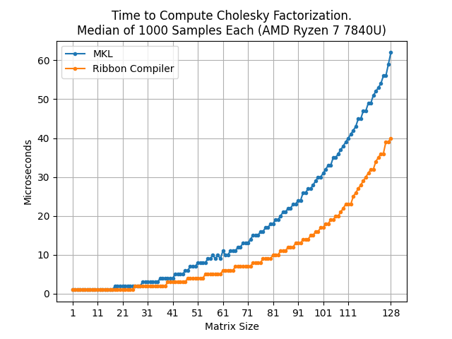 Presently, the Ribbon Compiler is targeted at embedded devices with fewer computing resources than a desktop processor. This means that generated programs work best if the linear algebra can fit in L2 cache. To quickly check performance, let’s compare against Intel’s Math Kernel Library (MKL) for small kernels. This is an industry standard for linear algebra performance.
